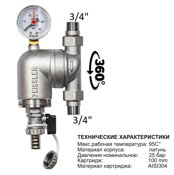 FixHot Zeissler 3/4" фильтр промывной для горячей воды с диаметром подключения 3/4", предназначен для механической очистки холодной и горячей воды. Установлен картридж из нержавеющей стали 100 мкм. Универсальный монтаж: вертикальная или горизонтальная установка фильтра. Фильтр FixHot позволяет очищать воду от различных нерастворимых мелких частиц, песчинок, ржавчины, окалины, волокон и т.д.