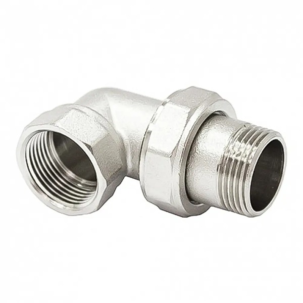 Соединитель угловой Skat sti размером 1" с внутренней и наружной резьбой, латунный с никелированным покрытием, резьбовой фитинг, служит для соединения между собой фитингов или элементов трубы в системе трубопровода.