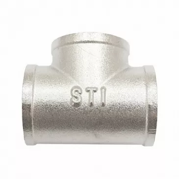Тройник Skat sti размером 3/4" с внутренней резьбой, латунный с никелированным покрытием, резьбовой фитинг равнопроходной, служит для соединения трех отрезков трубы, один из которых установлен перпендикулярно двум другим.