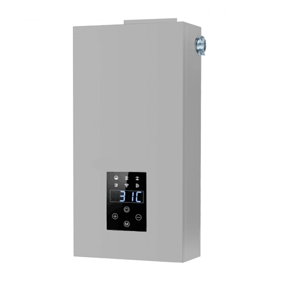 Skat 10 кВт электрический котёл, предназначен для отопления дома площадью до 100 м² (мощность 10 кВт). Котёл оснащён симисторным управлением, а регулировка котла осуществляется с помощью ЖК-дисплея. Сухой тэн выполнен из трубки нержавеющей стали. Котёл может работать с бойлером косвенного нагрева.