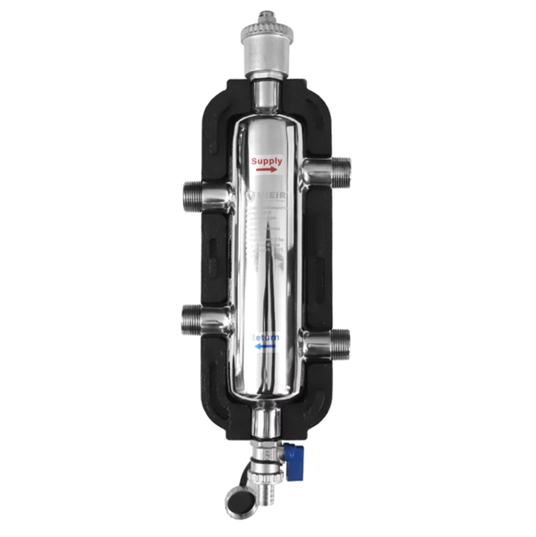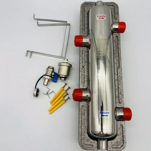 Vieir VMB-25-80 гидравлическая стрелка, 2 входа и 2 выхода. Мощность системы отопления до 80 кВт. Гидрострелка сделана из нержавеющий стали, в комплект входит утеплитель и крепление на стену.