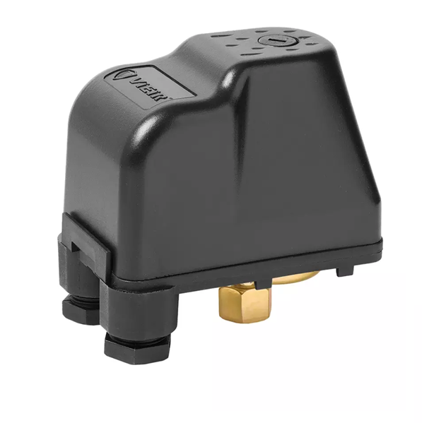 Vieir VR9С/1B реле давления, предназначено для автоматического управления включением и выключением однофазных водяных электронасосов, мощностью до 1.15 кВт. Заводские настройки реле включения/отключения – 1.3 / 2.6 бар, при необходимости реле можно перенастроить в диапазоне от 1.0 до 11.6 бар.