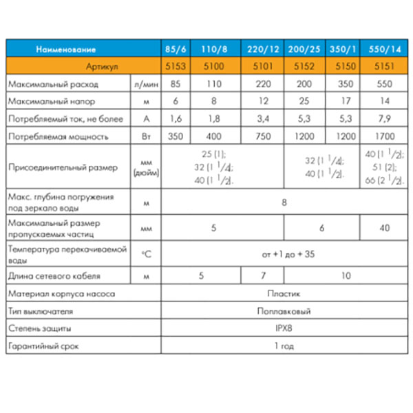 - Температура перекачиваемой воды: +1 до +35 °С.