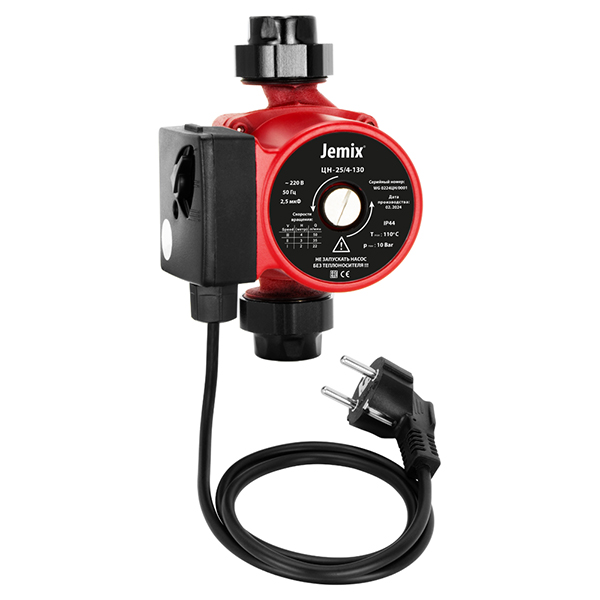 JEMIX ЦН 25/6-130 циркуляционный насос для системы отопления. Размер присоединительной гайки 1" (2 штуки) входят в комплект. Пропускная способность до 60 литр/мин и максимальный напор 6 метров при потребляемой мощности 100 Вт. Монтажная длина насоса 130 мм.