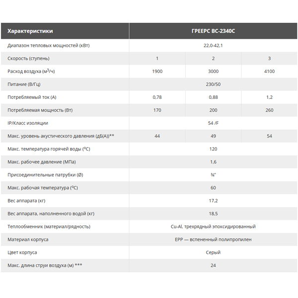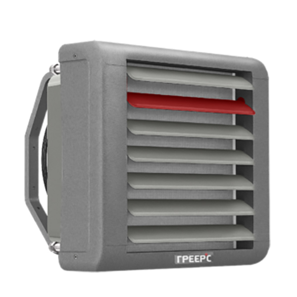 Водяной тепловентилятор Греерс ВС-2340С, отопительный прибор который использует радиатор и вентилятор для равномерного нагрева воздуха в помещении и быстрого его распределения во всех плоскостях. Диапазон тепловых мощностей: 22,0-42,1 кВт. Расход воздуха: 1900-4100 м3/ч. Модель оснащена встроенным трехскоростным двигателем и монтажной консолью (угол поворота – 170°).